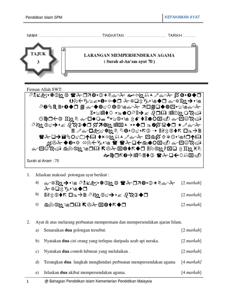 Larangan mempersendakan agama Al-Anam ayat 70. Larangan mempersendakan agama AYAT KEFAHAMAN. Baca versi flipbook dari 6 LARANGAN MEMPERSENDAKAN AGAMA.